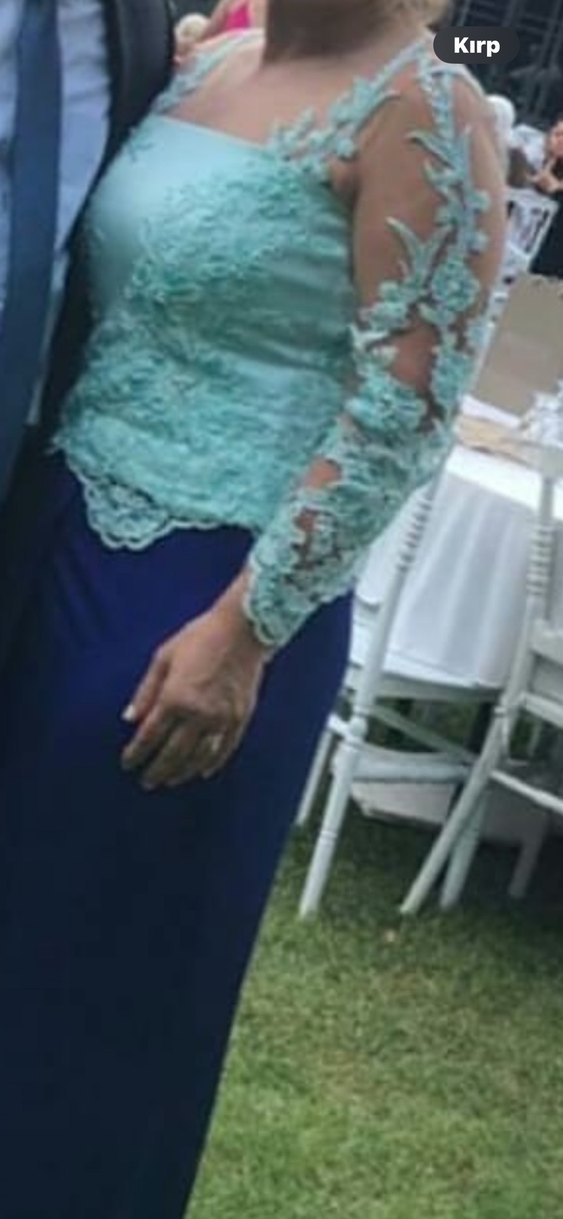 Turkuaz renkte, uzun kollu dantel detaylı, v yakalı ve vücuda oturan kesime sahip dantel işlemeli vintage bohem tarzda abiye bluz sadece 1 kez giyildi özel dikimdir