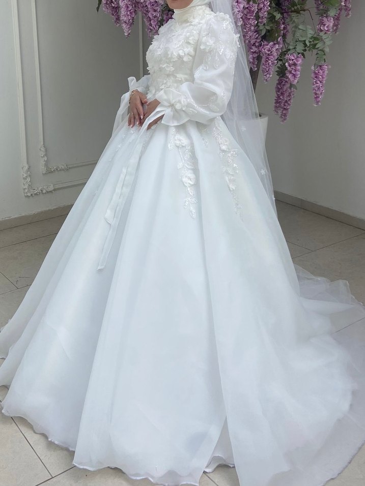 Bu beyaz prenses gelinlik, uzun kollu ve bol kesim olup çiçek detaylarıyla klasik ve zarif bir görünüm sunar. Kimsede bu modelin aynısından göremezsiniz kumaşına kadar her detayını kendim seçtim. Sizi özel gününüzde çok özel hissettireceğine eminim. Almak isterseniz uygun fiyattan satıyorum. Gelinlikçilerin sıfır dediği gelinliği bile en az günde 20 kişi deniyor eskiyor. Ben üzerime özel diktirdim sadece 1 gün giydim. Sonrasında temizlettim. Alacak olan ikinci el olarak düşünmesin uygun fiyata hiç giyilmemiş gelinlik olarak görsün