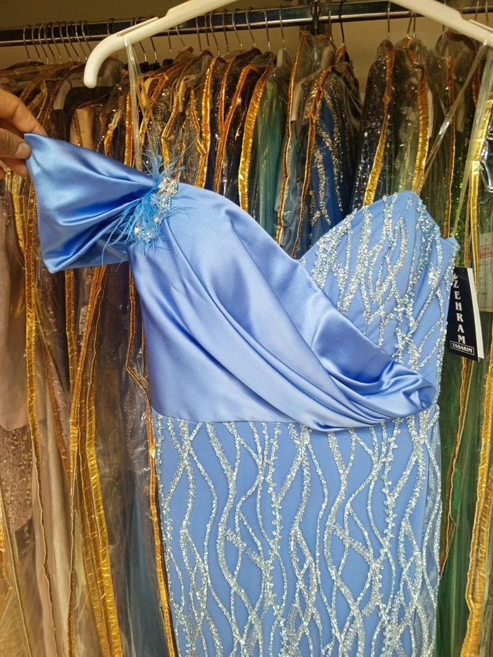 40 beden özel dikimUzun ve vücuda oturan bu abiye elbise, straplez yakası, drapeli saten kumaşı ve parlak mavi işlemeleriyle dikkat çekiyor. Partiler için ideal.