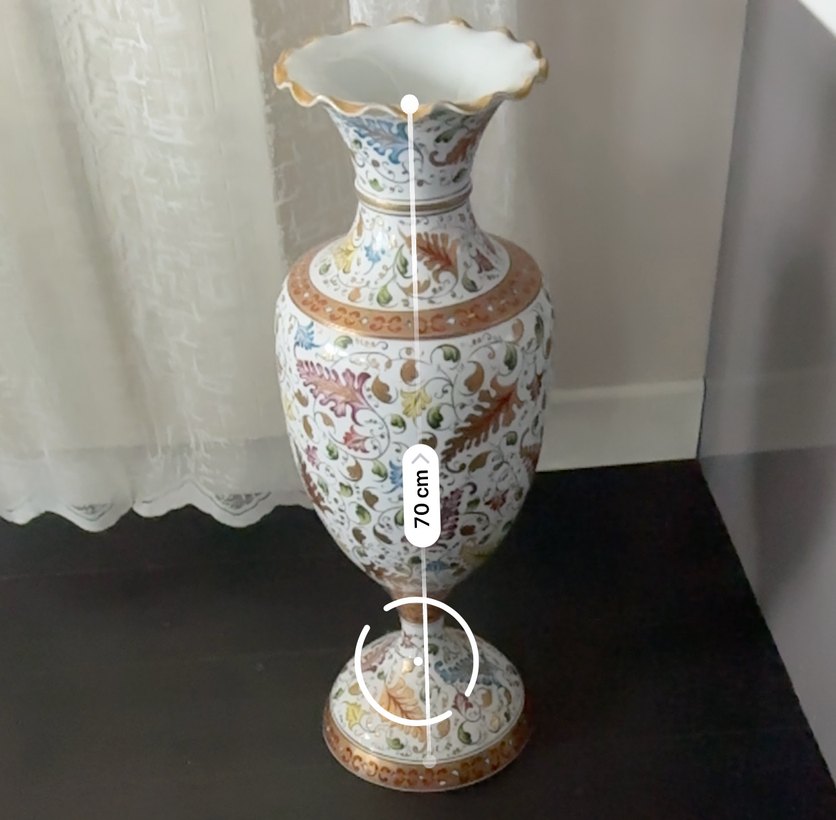 70 cm yüksekliğinde beyaz seramik vazo, renkli desenler ve genişleyen üst kenarıyla dekoratif bir görünüm sunar. Special hand made. Hatasız.