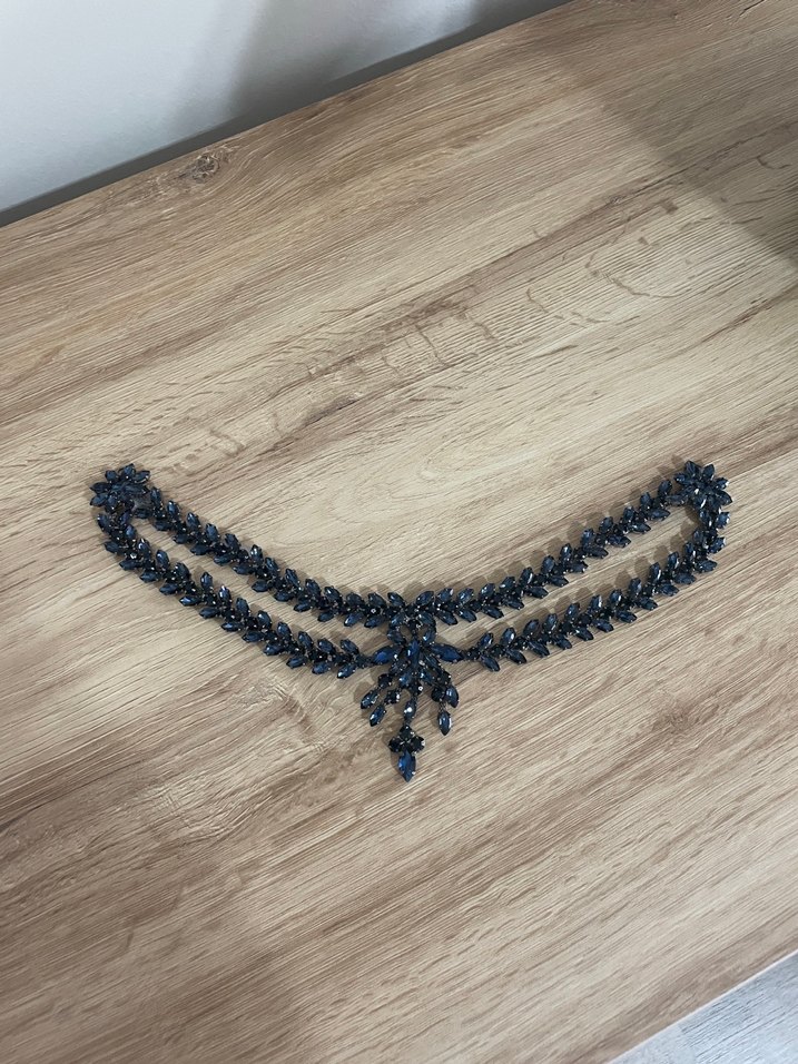 Koyu mavi renkte, boncuk işlemeli ve nakış detaylı vintage bohem tarzda vücut zinciri, günlük kullanım için uygundur.