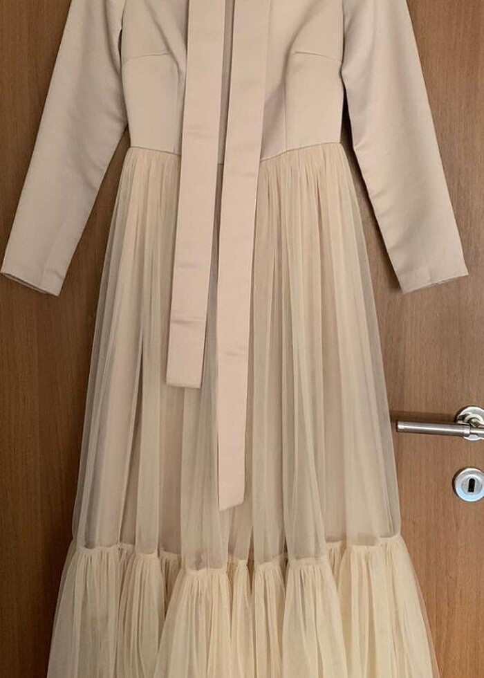 Üst kısmı amerikan saten olup alt kısmı ise tüldür Ürün 1 kez düğünde giyilmiştir Ürün boy:133 Bel:32 Göğüs:40 Renk:cappuccino rengi Elbise düğün ve davetler için güzel bir seçimdir