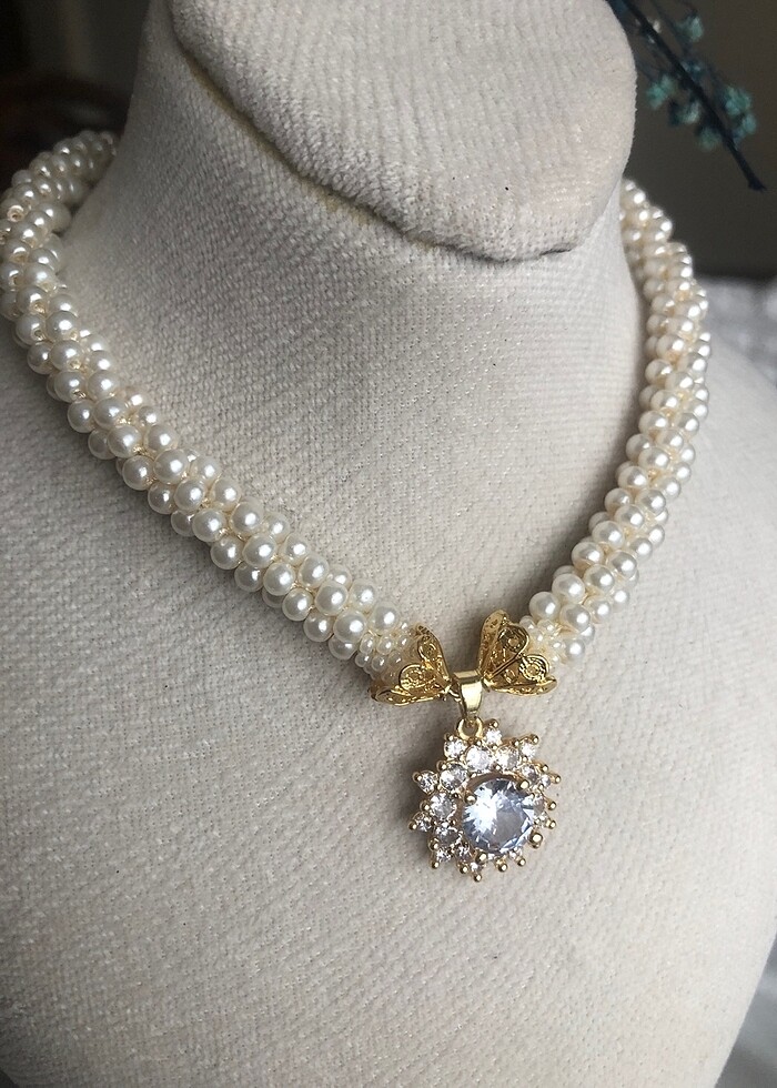 Kolye yapımında cam inci ve zirkonyum taş kullanılmıştır.bileklik ise cam inci ve çeyrek ortası olarak yapılmıştır