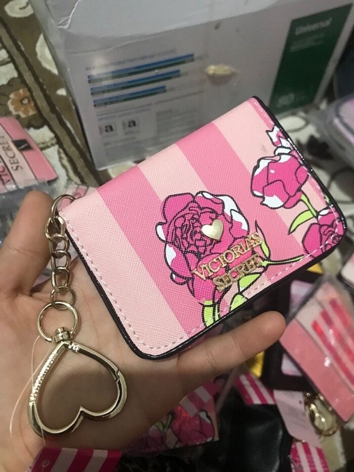 Victoria's Secret pembe çiçek desenli kadın cüzdan, fermuarlı ve deri malzemeden yapılmıştır. Kalp şeklinde anahtarlıkla birlikte, günlük kullanım için uygundur.