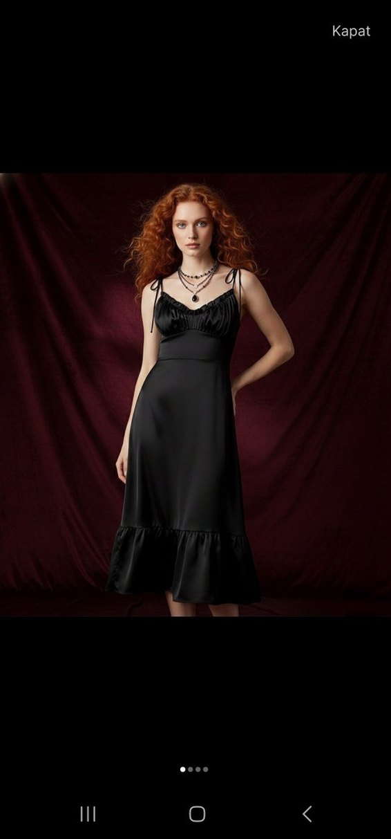 Bu siyah, v-yaka, askılı, saten görünümlü midi elbise, vücuda oturan kesimi ve etek ucundaki fırfır detaylarıyla romantik akşamlar için uygundur.