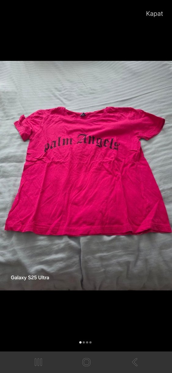Koyu pembe renkli, kısa kollu ve yuvarlak yakalı kız çocuk tişörtü. Yumuşak keten kumaştan, baskılı 'Palm Angels' yazılı, rahat kesim sokak stili tişört.