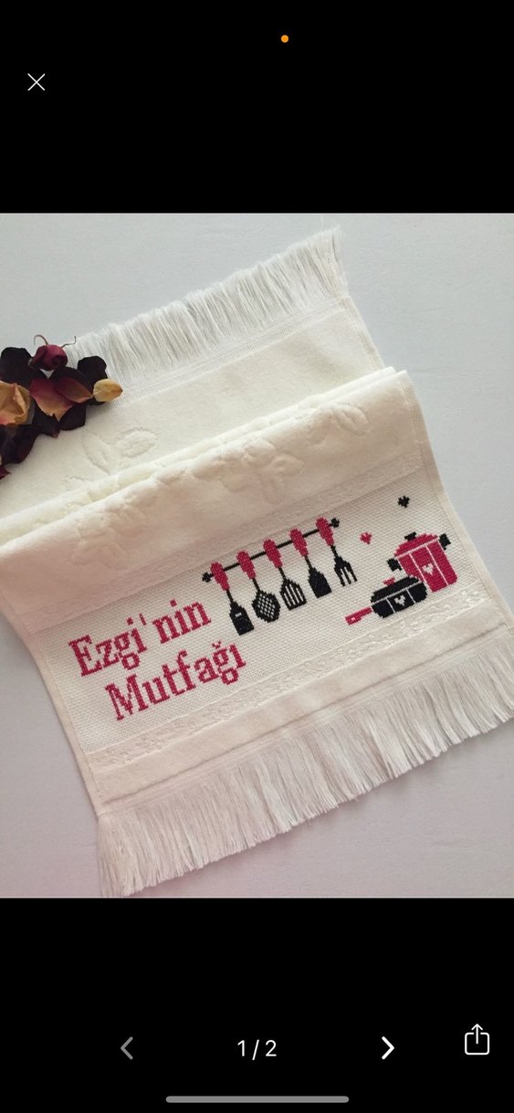 Beyaz, nakışlı mutfak gereçleri ve "Ezgi'nin Mutfagi" yazılı geleneksel tarzda, püsküllü kenarlı mutfak havlusu.