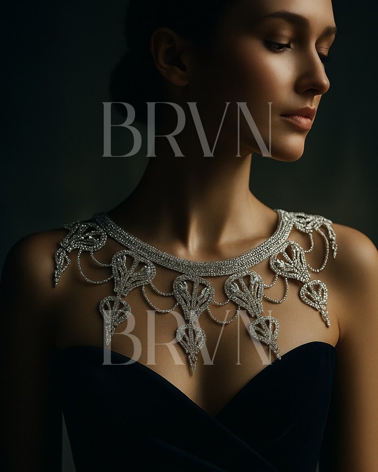 Zarafetin Buluşma Noktası Omuzlarınıza dökülen bu göz alıcı tasarım, sadece bir takı değil; duruşunuzun, karakterinizin ve asaletin simgesi. Zamak metal üzerine Swarovski taşlarla işlenmiş bu özel kolye, ilk bakışta etkileyici bir ışıltı, uzun bakışlarda ise unutulmaz bir iz bırakır. Kurşun ve nikel içermez. Her bedene özel ayarlanabilir yapısıyla kadınların zarafetini öne çıkarır. Su ve parfümle temastan uzak tutarak ilk günkü ışıltısını yıllarca koruyabilirsiniz. Bu bir takı değil. Bu bir duruş. Girdiğiniz her ortamda kendini belli eden, güçlü kadınlara özel tasarlandı. Omzunuzda sadece bir kolye değil, bir taç taşıyacaksınız.