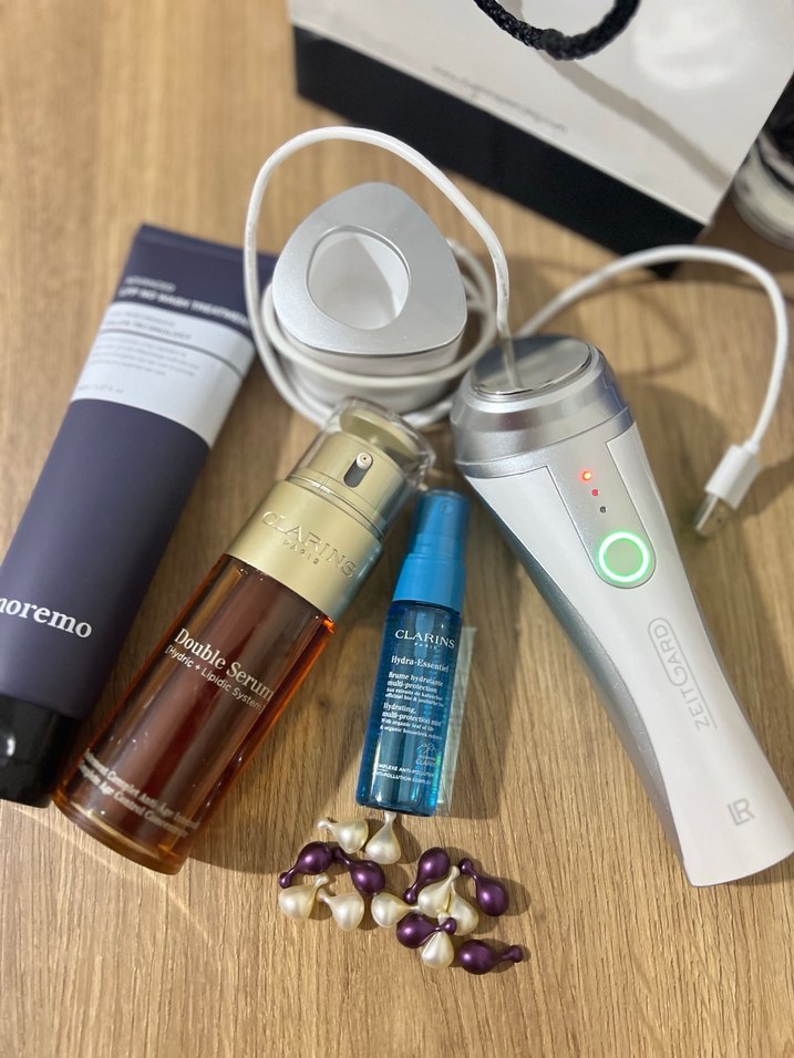Zelgard mavi ve gri renkte kişisel bakım cihazı, şık tasarımı, gösterge ışıkları ve USB şarj kablosu ile birlikte gelir . Clarins serum mucizesi ve hydra çanta bot mist nemlendirici spreyi