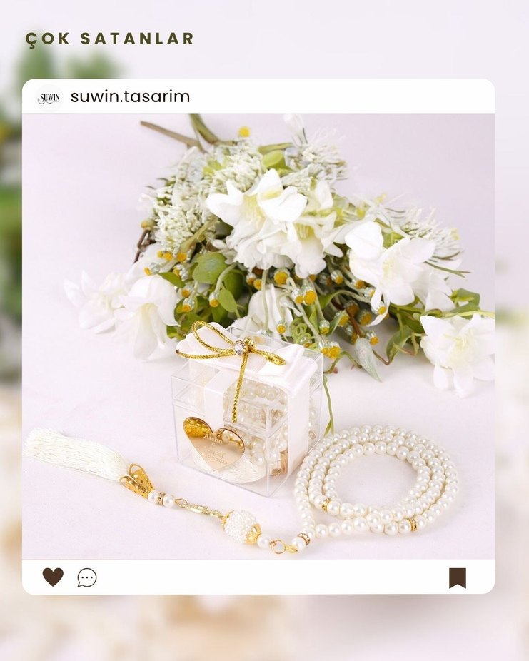 İnci tesbih , püskül ve altın detaylı şeffaf hediye kutusunda sunulur. Klasik zarafet için uygundur.