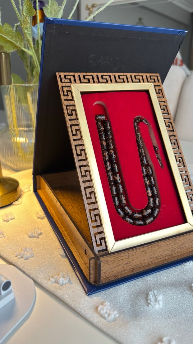 Koyu renkli vintage erkek tesbih seti, altın detaylı kutusunda geleneksel tasarım öğeleri taşır,