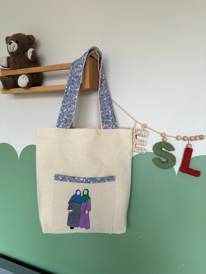 İstenilen resim nakış ile görsele dönüştürülür kalın keten kumaştır askıda ve cepte çiçekli kumaş kullanılmıştır