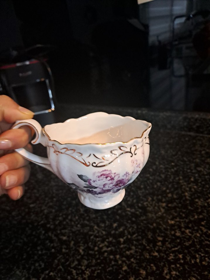 Mor çiçek desenli, ince, altın detaylı zarif bir fincan. ☕
