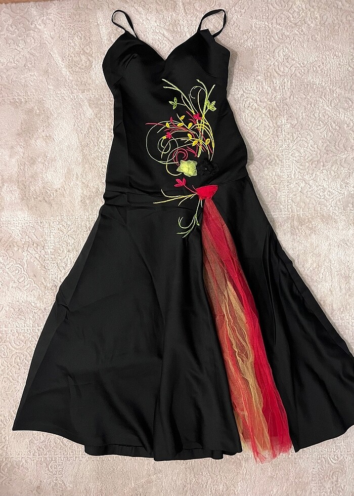 Kendi tasarladığım elbise terzi tarafından bana özel dikilmiştir. 2 kez giyildi. Siyah yumuşak taftadan, balenli, sarı pembe siyah kalıplı tüllerden yırtmaç detayı ve eteği biraz kabarık dursun diye siyah tülden iç katmanı var. Benim boyuma (155 cm) göre dikildi.