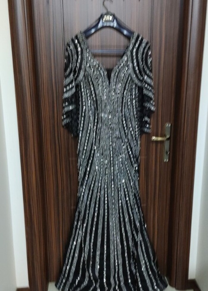 Özel tasarım inci ve taş işlemeli kuyruklu kol ve sırt detaylı abiye