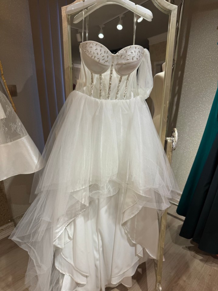 Ürün özel dikimdir, önü mini arkası uzundur. Fotoğraf çekimi bride partisi after için uygundur. 1 kez giyildi herhangi bir problemi yok. Mağazalar yazmasın, kendi mağazamda yer açmak için gerçekten ihtiyacı olan bir geline nasip olmasını umarak komik bir rakam giriyorum. Şimdiden giyene şans getirsin. 36/40 beden uyumlu arkası biritli.