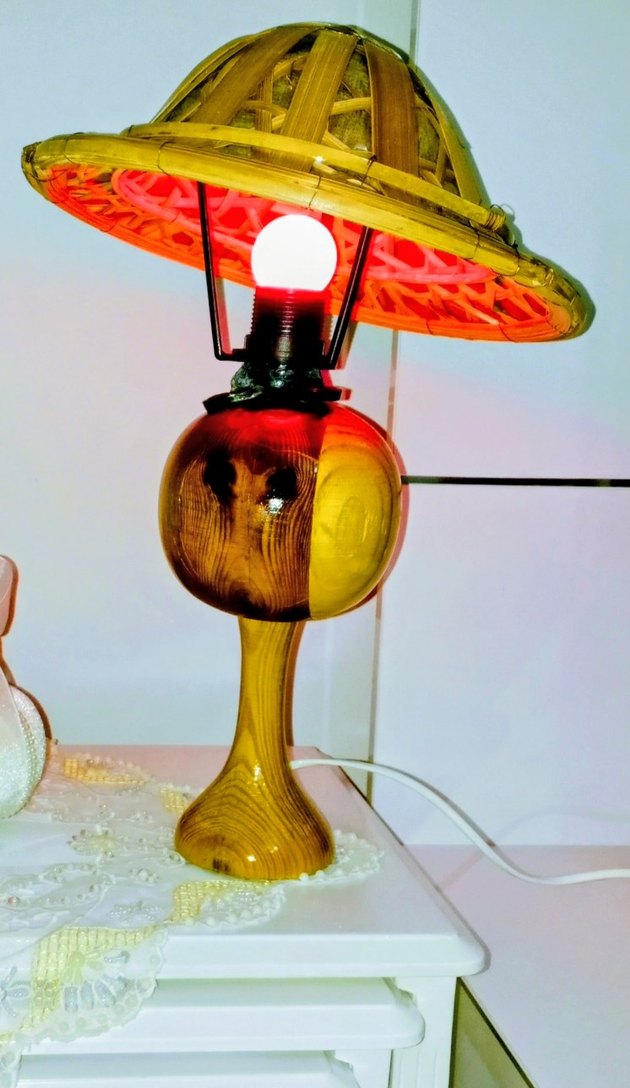 Renkli turuncu şapkası ve yuvarlak ahşap gövdesiyle sıcak bir ışık sunan masa lambası.