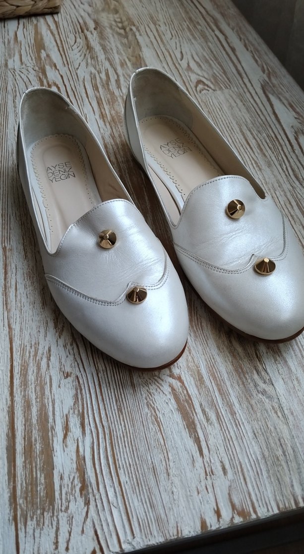 Düğmeli, parlak bej deri kadın loafer. Modern klasik tarz ve blok topuk ile her ortam için uygun.