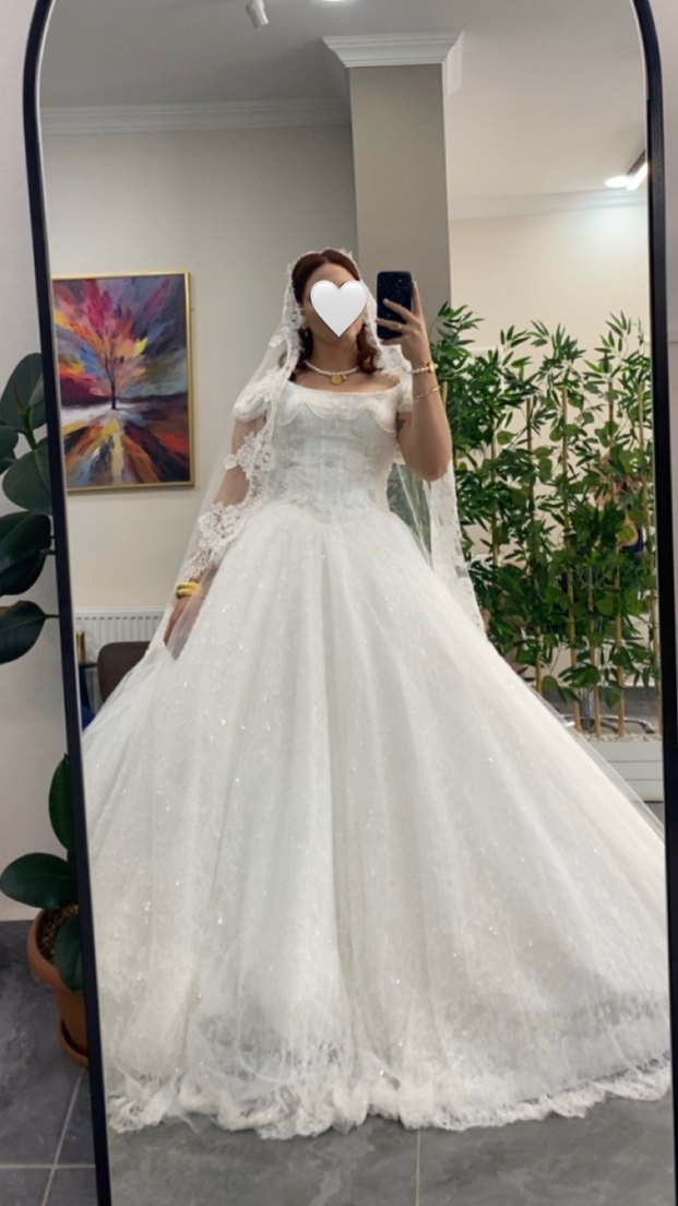 Özel dikim prenses gelinlik, oturan üst kısmı ve midi uzunluğundaki eteği ile klasik şıklığı hafif gotik dokunuşla birleştirir. İnce askılı kollara sahip konvansiyonel tarzda bir model. Bel kısmının korseliği gelinliğe ağır bi hava katarken bir yandan da sıradanlığı yok eder . 40-42 beden . Duvak ve tarlatanıyla full part gelinlik