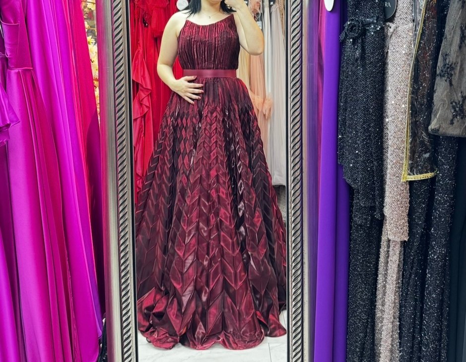 Özel tasarımdır. Başka bir yerde bulamazsınız. Bordo renkli, V yakalı, pilili ve desenli uzun etekli, fitted kesim ve kolsuz abiye elbise. Bedeni her bedene uygundur arkası iplidir ve sıkarak bedeninize uygun hale getirebilirsiniz. 38 beden olarak yazmakta ancak ben kendim için iple 44 bedene kadar çıkardım. 36/38/40/42 beden içinde kolayca uygundur. 30.000₺ ye satın aldım nişanım için. Bir kere giydim. Bir daha kullanmayacağım için satıyorum.