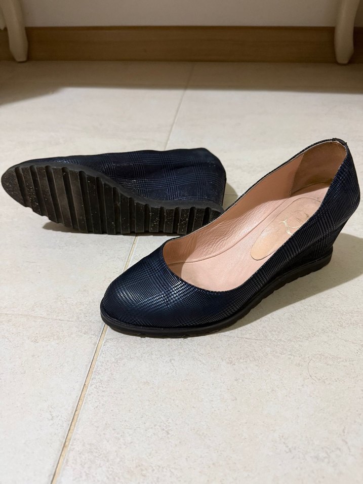 Kadınlar için klasik lacivert dolgu topuklu ayakkabılar, yılan desenli plise detaylı kauçuk malzemeden üretilmiştir, şıklık ve günlük rahatlığı bir arada sunar.