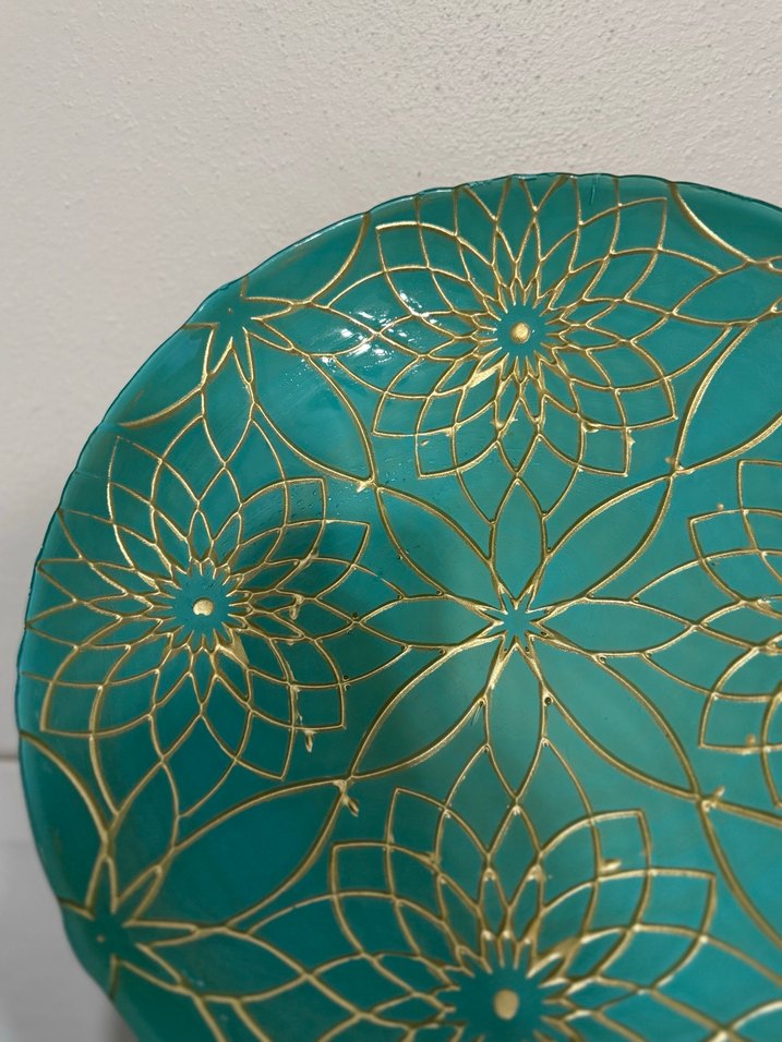 Yaklaşık 40 cm çapındadır. Şık deseni ve büyük boyutu sayesinde salon, masa veya vitrin dekoru olarak çok dikkat çekicidir. • El yapımı cam • Büyük boy (≈40 cm) • Vitrinlik / dekoratif • Meyve kasesi veya dekor amaçlı kullanılabilir • Temiz, sorunsuz Yurt dışı satış fiyatları oldukça yüksektir. Elden teslim veya kargo imkânı vardır. Ciddi alıcılar yazarsa sevinirim.