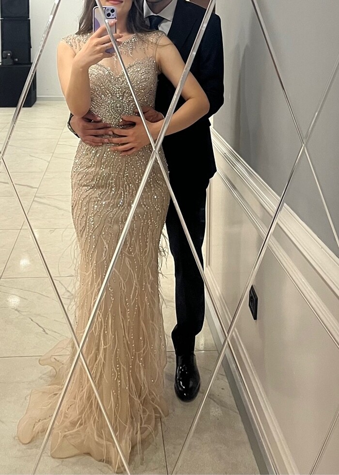Özel tasarım elbise nişanım da kullandım. Adana Romance mağazasından alındı. Kuru temizleme yapıldı kılıfıyla birlikte gönderilecek. Rengi şampanya rengi olarak geçiyor