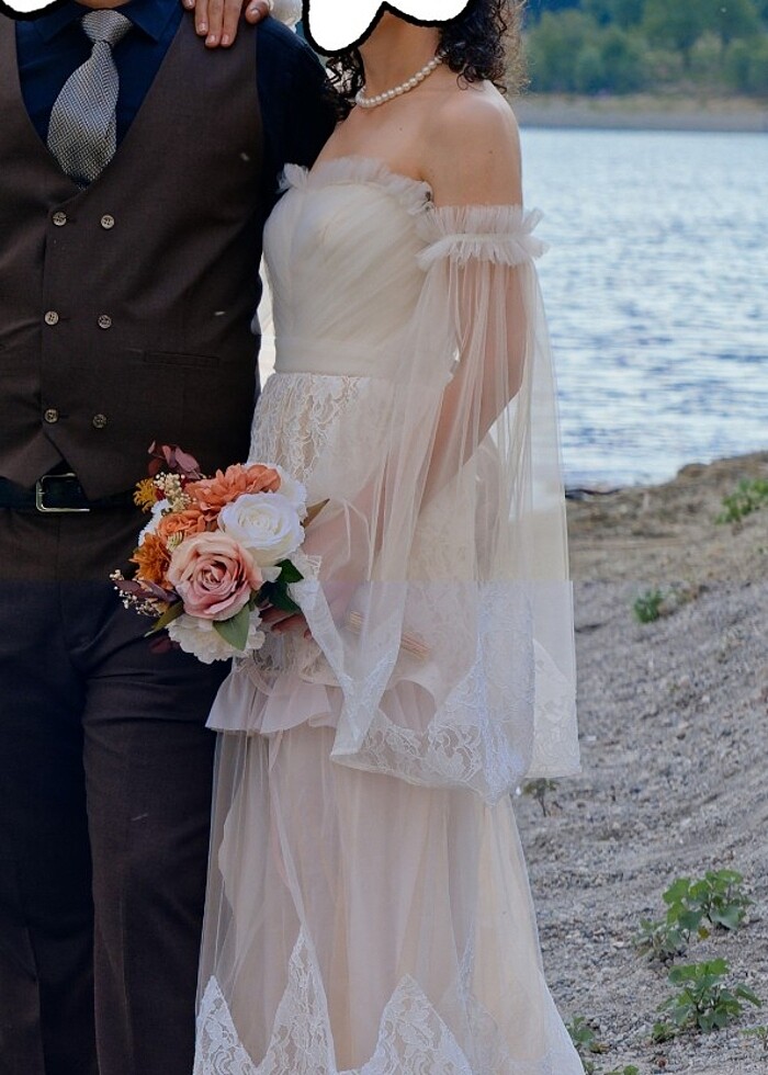 34-36 beden uyumlu özel tasarımdır. Yalnızca bir defa fotoğraf çekimi için giyildi. İstenirse düz tülden duvağı da mevcuttur. Kuru temizlemesi yapıldı.