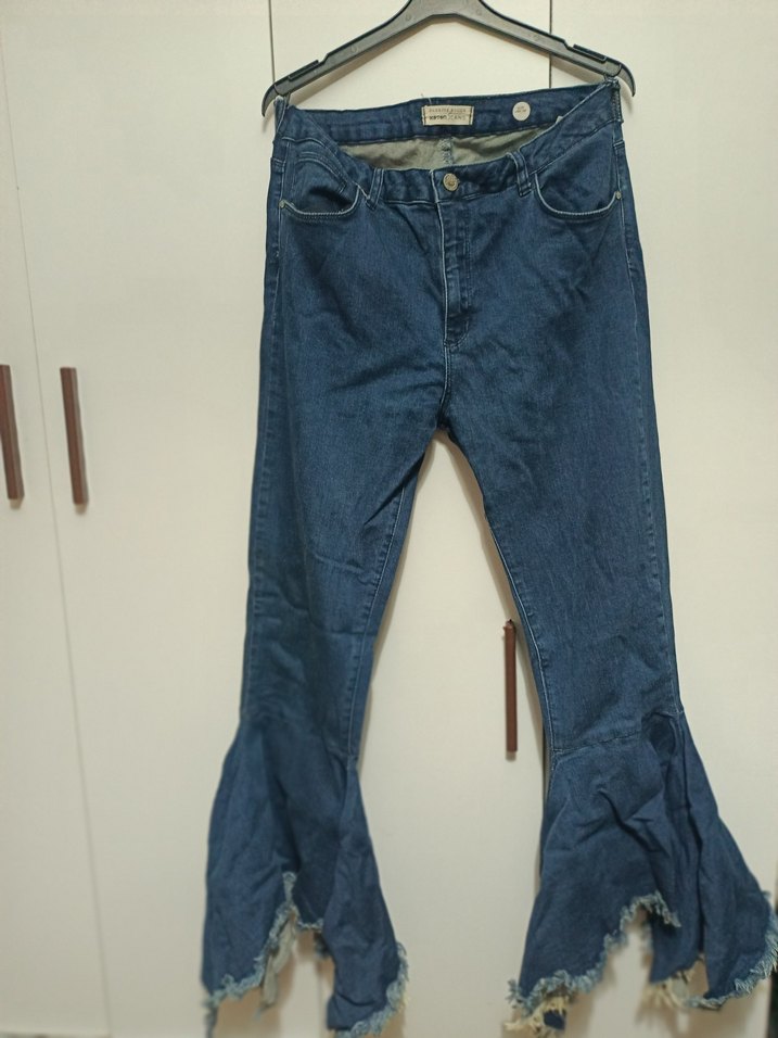 Mavi denimden, salaş kesimli ve fırfırlı paçaları olan kadın pantolonu. Günlük kullanıma uygun, rahat ve sokak stiline uygun.