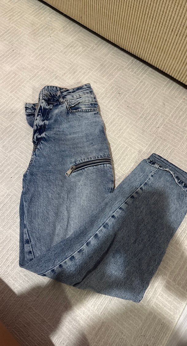 Gri batik desenli, fermuarlı cepli, rahat kesim kadın kot pantolon, günlük sokak stili için uygun.