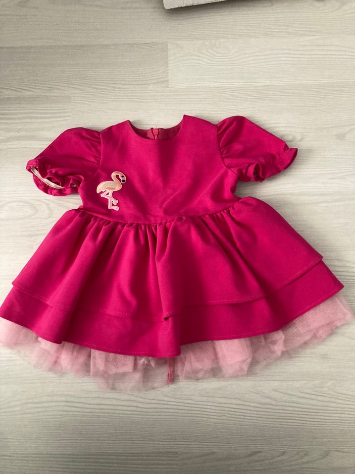 Pembe kız çocuk elbisesi, kısa kollu ve yuvarlak yakalıdır. Renkli nakışlı, bol kesim ve fırfırlı detaylara sahiptir. Yumuşak ve sıcak kumaştan yapılmıştır.