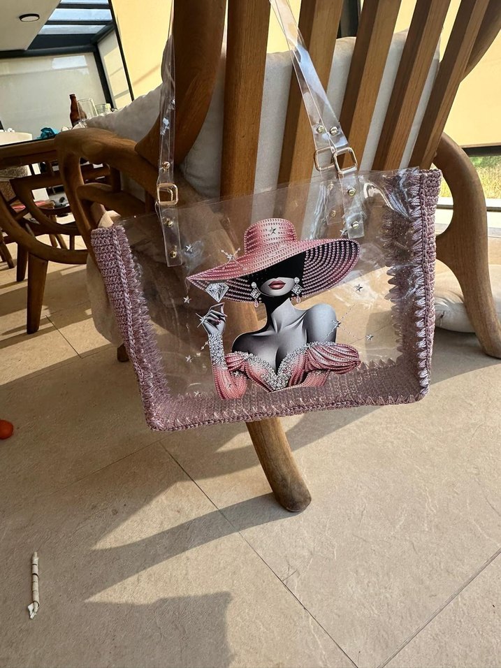 Pembe ve gri baskılı, tokalı, şeffaf detaylı sentetik kumaştan yapılmış bohem tarzda günlük kullanıma uygun kadın çantası.