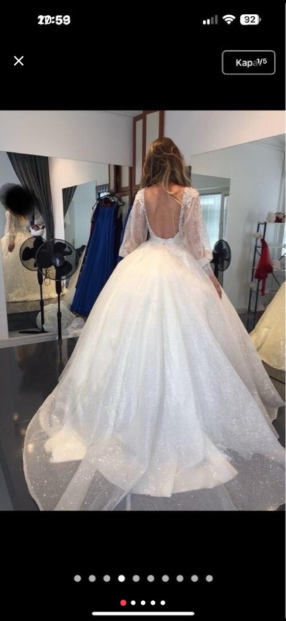 Bu kırık beyaz prenses gelinlik, sırt dekolteli uzun balık kolludur, bol kesimlidir. Modern klasik tarzda, gösterişli ve klasik zarafet için uygundur. Uzun boyda, hafif renkli ve ışıltılı kumaşa sahiptir. ✨