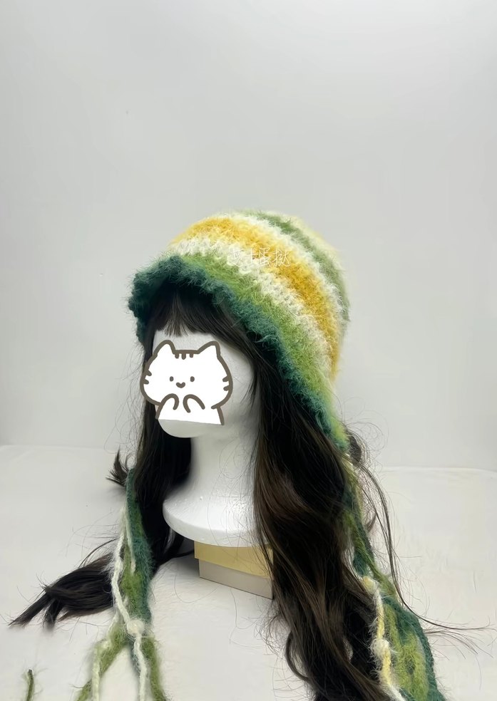 Kadınlar için örgü, pastel renkli çoklu şeritlere sahip, uzun örgülü bağcıklarıyla bohem ve retro tarzını yansıtan rahat bir bere.