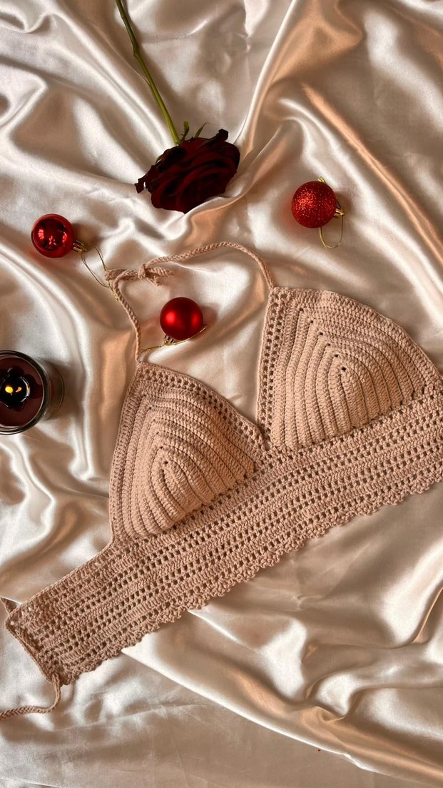 Ürün özel yapım tığ örgüsüdür. kişiye ozel renk ve beden secenekleri yapılır. Bej renkli, V yakalı, askılı ve bol kesim kısa uzunlukta örgü büstiyer, rahat ve bohem tarzı yansıtıyor.