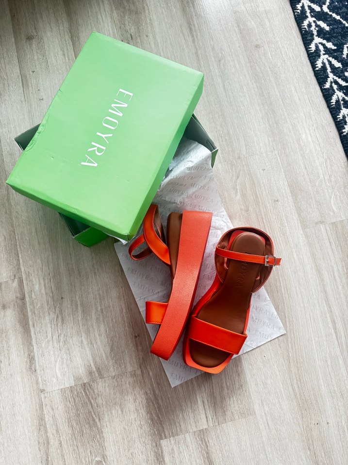 Özel üretim, Turuncu renkte platform topuklu, tokalı kadın sandaletler. minimal ve çağdaş tasarıma sahip. Günlük kullanıma uygun rahat model. EMOYRA markası.