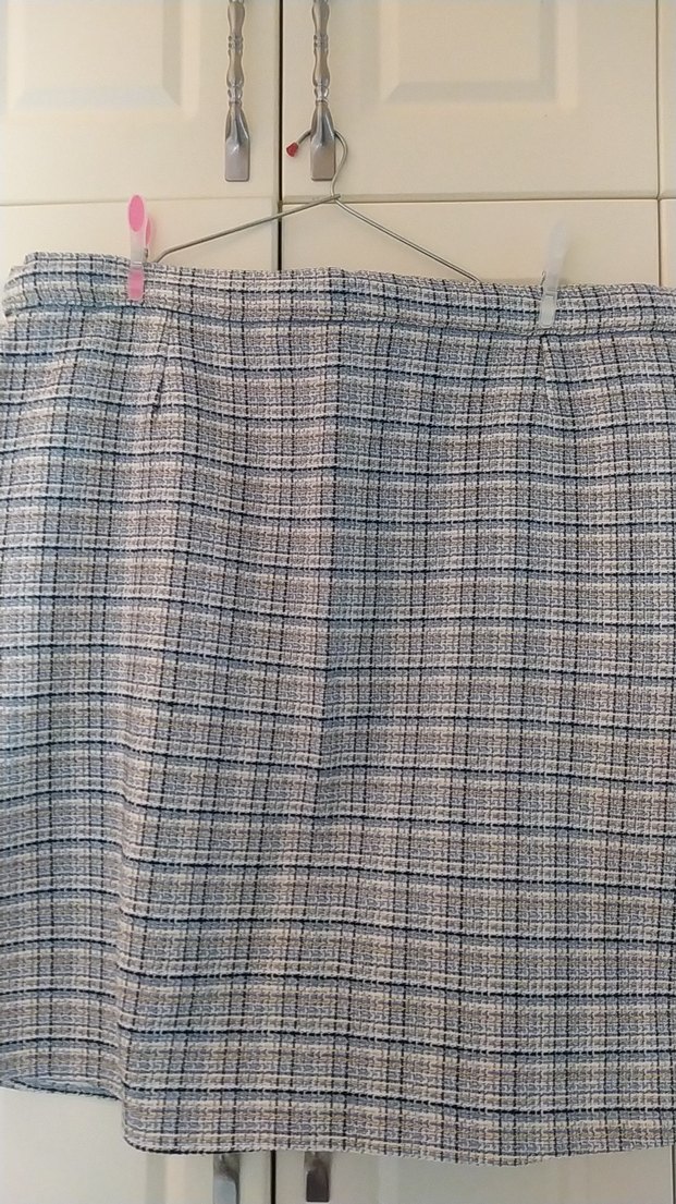 Gri ve mavi midi boy düz etek. günlük kullanım için konforlu ve şık.
