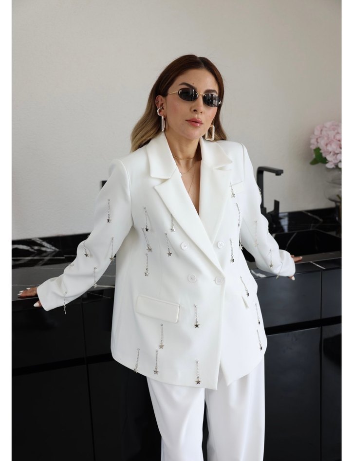 Uzun uzun kollu, düğmeli, beyaz blazer ceket. Ofis için uygun, regular fit ve yakası kesik modeldir. ✨