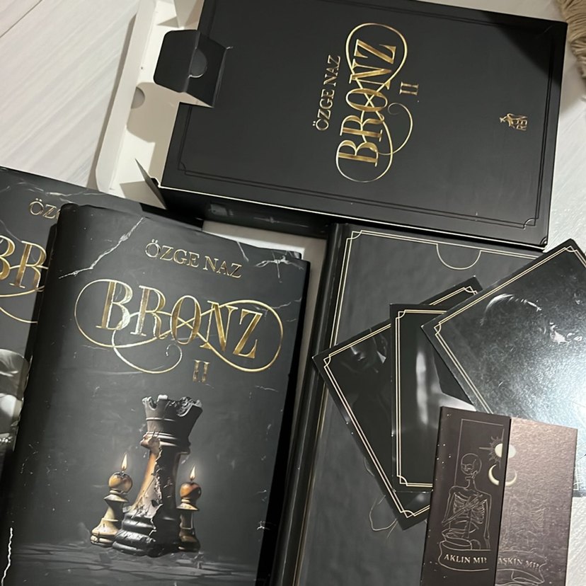 Özgenaz Bronz roman seti, siyah kapaklar ve altın yazılarla iki ciltten oluşur. Satranç temalı tasarımı ve ek kartlarla birlikte gelir.