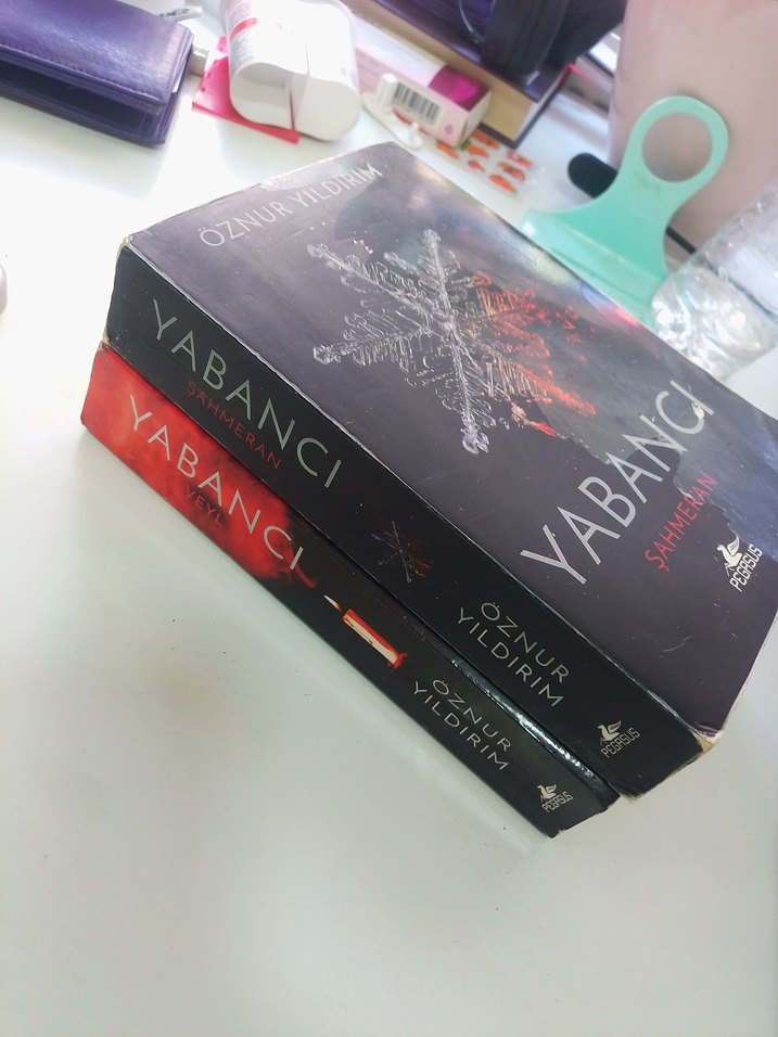 Öznur Yıldırım'ın "Yabancı" adlı iki romanı, kar ve ateş temalı kapaklarla üst üste konmuş kitaplar.