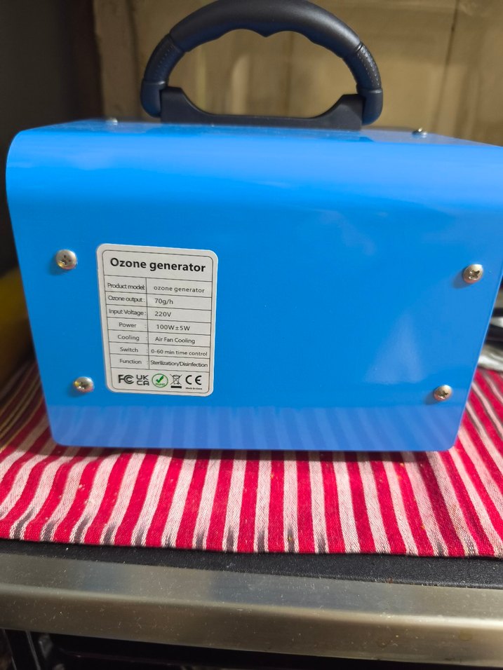sterilizatör, ozon jeneratörü fonksiyonlu, hava fanlı soğutmalı ve 220V güç girişli. Sterilizasyon için kullanılır. 70gr/saat üretme gücündedir. 60 dakikaya kadar çalışma süresini seçebileceginiz zamanlayıcı mevcuttur. kullanacağınız ortam havası aşırı yağlı veya nemli ise ince tül içinde çalıştırmanız cihazın ömürlü olması açısından tavsiye olunur.