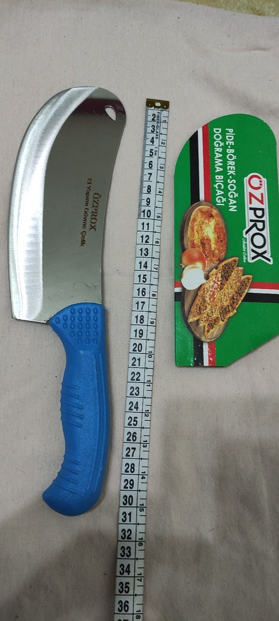Koyu mavi saplı, pide, börek ve soğan doğramaya uygun sağlam bıçak. Üzerinde OZPROX marka yazısı bulunur.