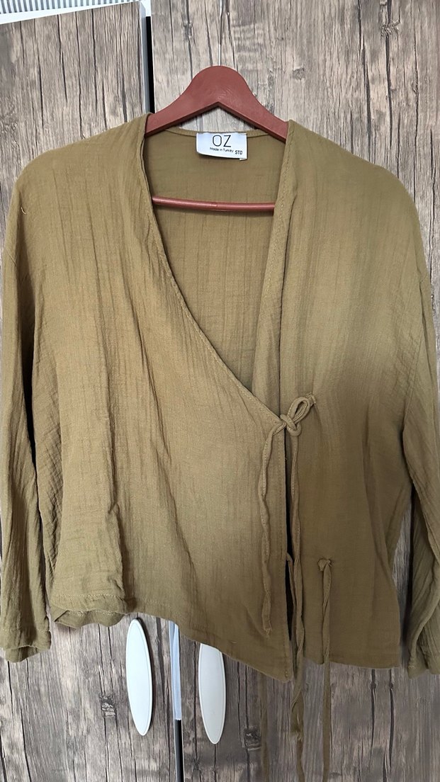 Bohem tarzda, keten kumaştan,haki renkli, düğmeli, V yakalı, uzun kollu ve bol kesim