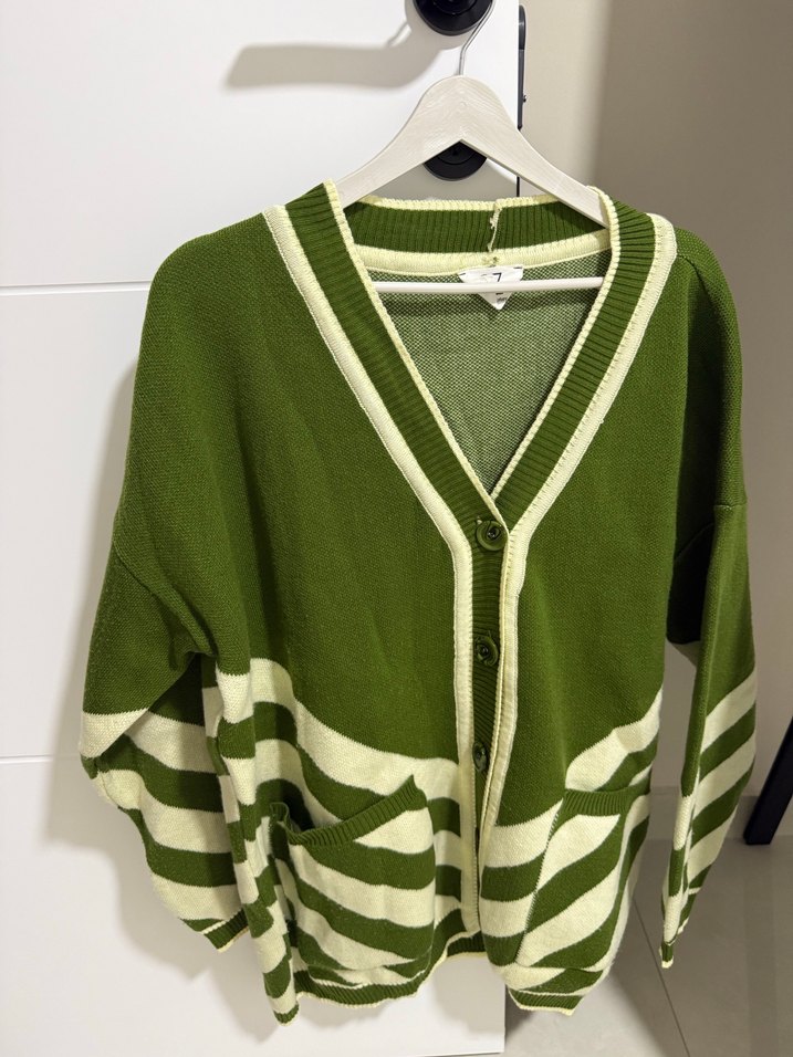 Kadınlar için yeşil ve beyaz çizgili, V yaka, uzun kollu, bol kesim örgü hırka. Midi boyda, iki cepli