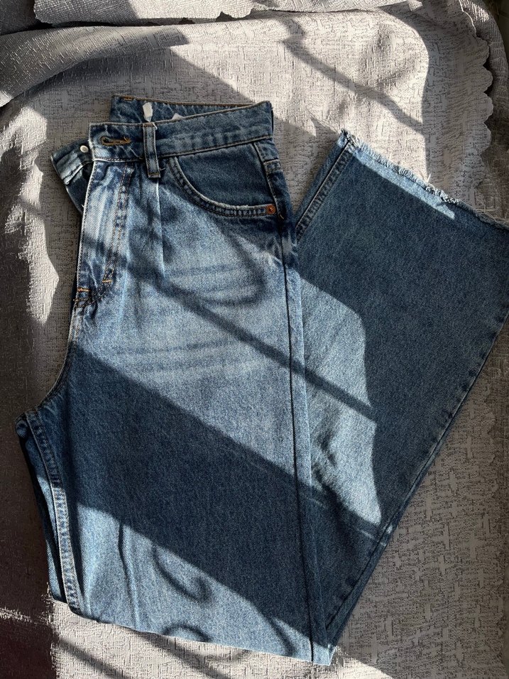 Rahat kesim, desen içermeyen kadın kot pantolon. Denim kumaştan, gündelik şıklık için uygundur.