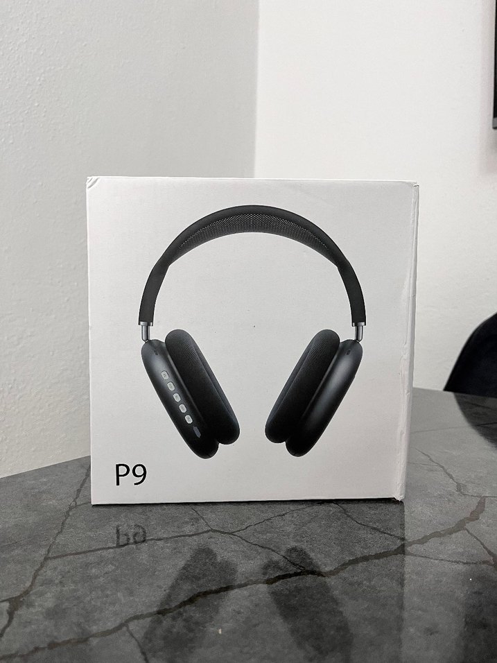 P9 siyah kablosuz kulaklık, konfor için yastıklı kafa bandı ve kulak pedlerine sahiptir. Yan tarafında kolay kontrol düğmeleri bulunur.