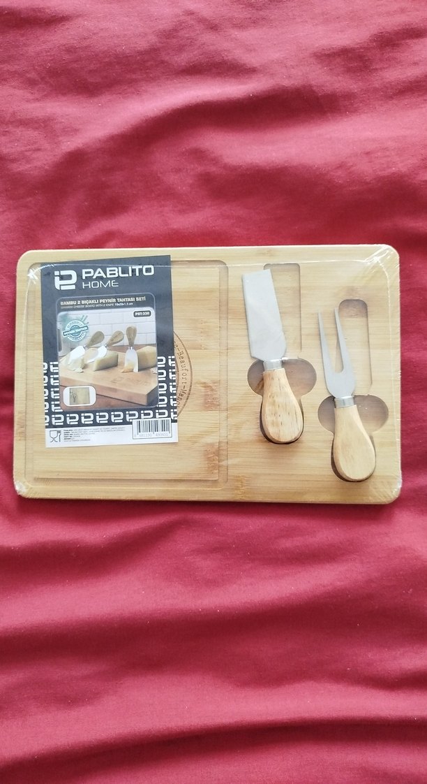 Pablito markalı peynir kesme seti, bej renkte ahşap kesme tahtası ve iki açık renkli saplı peynir bıçağı içerir. Kolay dilimleme ve servis sağlar.