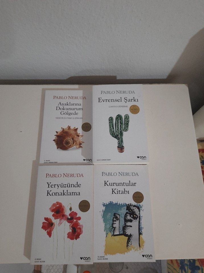 Pablo Neruda'nın Can Yayınları'ndan çıkan dört kitabı: Ayaklarına Dokunurum Gölgede, Evrensel Şarkı, Yeryüzünde Konaklama ve Kuruntular Kitabı.