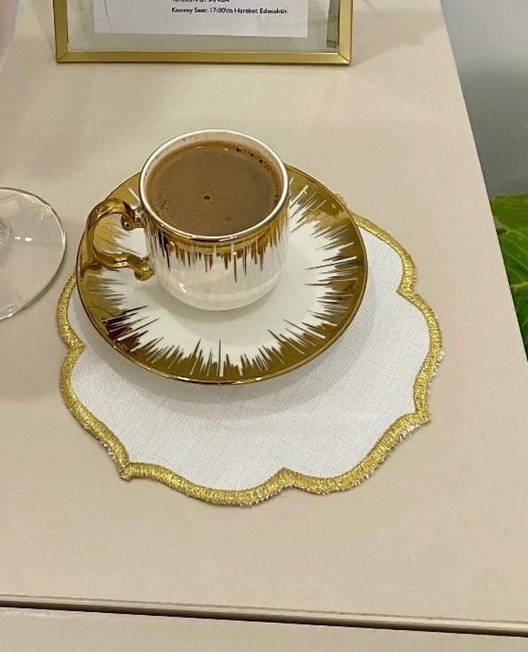 Parlak beyaz ve altın detaylı kahve fincanı ve tabağı, kahve keyfinize şıklık katıyor. Çeyiz için sergilenmek üzere kuyularından çıkarılmıştı kullanılmamıştır hiçbir sorunu yoktur ihtiyaç fazlası dolabımı azaltmak istediğim için satıyorum