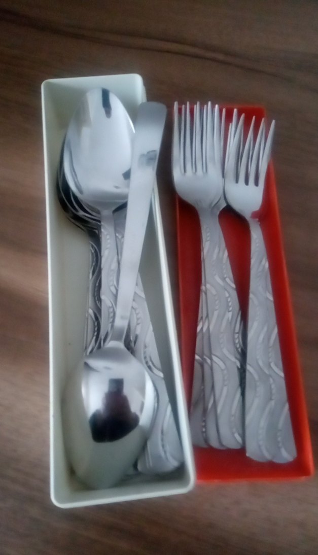 Gri desenli saplara sahip çatal, kaşık ve bıçaklardan oluşan set, kırmızı ve beyaz tepsilerde düzenlenmiştir.36parça, hepsini alana pazarlık payı vardır Acar marka (6adet fiyatı)